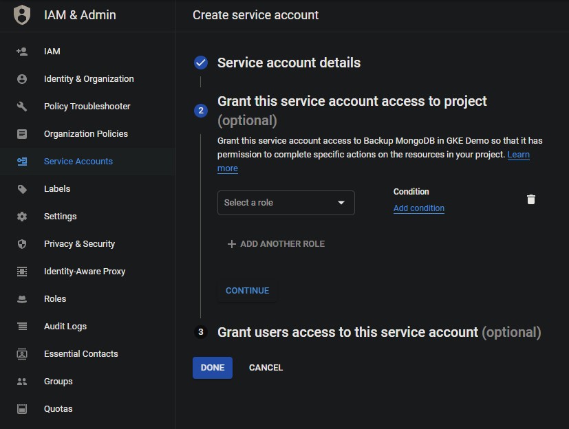 ถึงตรงนี้จริง ๆ เราสามารถให้สิทธิ์จัดการ Google Cloud Storage กับ Service account นี้กับทั้ง Google Cloud Project นี้ได้เลย